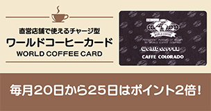 「WORLD COFFEE CARD」は、ワールドコーヒー直営店舗で利用できる、チャージ型のプリペイドカードです。店頭で簡単にチャージができ、繰り返しご利用いただけます。登録料や年会費は一切不要で、チャージ金額に応じてポイントがもらえるお得なカードです。